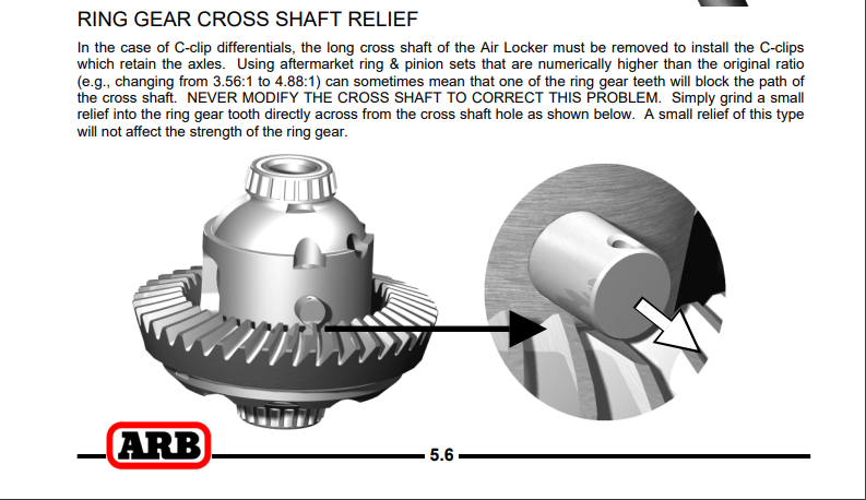 C-Clip Axle Locker Modification On C-Clip style axle lockers a modification must be made to the ring gear in order to allow the cross shaft pin to be removed when the ring gear is installed. See attached diagram for modification.